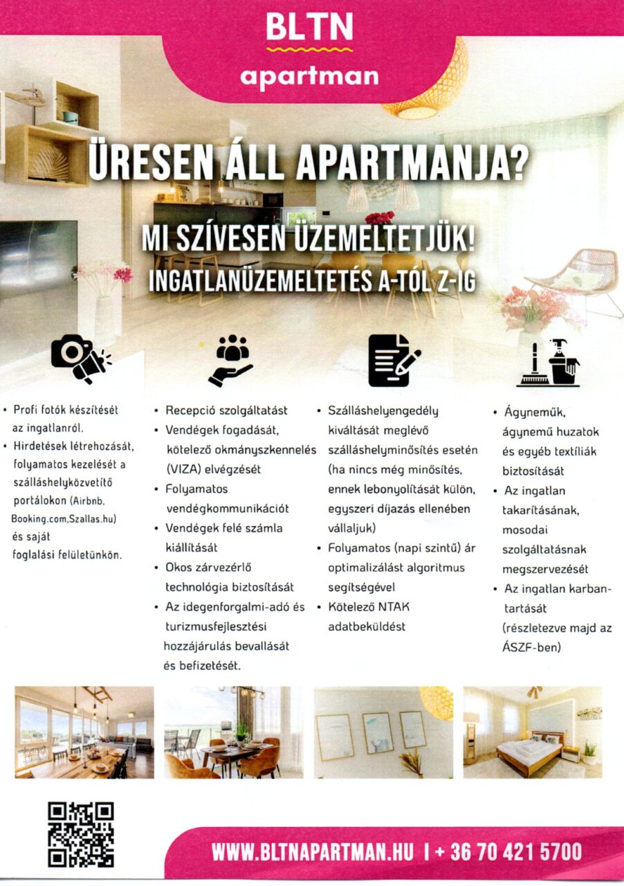 Egy tapasztalt cég, mint a BLTN Apartman, tehát nem csupán tehet vesz le a tulajdonosok válláról a mindennapi üzemeltetési feladatok átvételében, hanem hozzáértő módon kezeli a marketinget, a vendég kapcsolatokat és a pénzügyi tervezést is, így hozza ki a legtöbbet a balatoni apartmanja üzemeltetéséből.